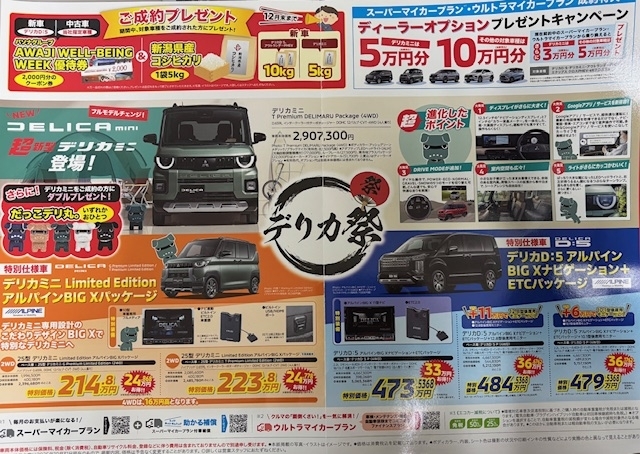 Staff Blog スタッフブログ 202601/05 紅白だっこデリ丸。🐶 こんにちは! 岸和田東店 西野です! 1月9日~11日までの期間で「紅白だっこデリ丸」を 東京オート… 202601/04 謹賀新年🎍 こんにちは! 岸和田東店 西野です! 皆様明けましておめでとうございます! 本年も何卒宜しくお願い致… 202512/26 年末年始休業のお知らせ こんにちは! 岸和田東店 西野です! 12月28日(日)~1月3日(日)までの期間 休業とさせて頂き… 202512/22 ★新旧デリカミニ★ こんにちは! 岸和田東店 西野です! ショールームの展示車入れ替えしました! 新型デリカミニの方はア… 202512/15 新型デリカD:5内覧会実施します! こんにちは!岸和田東店 西野です! 12月18日(木)~12月21日(日)まで新型デリカD:5特別内… 202512/06 ★AXCR 優勝記念Tシャツ★🚙 こんにちは! 岸和田東店 西野です! 早速ですが、アジアクロスカントリーラリー 2025 優勝したこ… 202512/06 新型デリカミニ ☆ワイルドアドベンチャースタイル☆ こんにちは! 岸和田東店西野です! 今日は風は冷たく感じますが、よく晴れて気持ちのいい日になりました… 202512/04 ボトルキープ販売終了のお知らせ こんにちは! 岸和田東店西野です! 長年ご愛顧頂いていたボトルキープが昨今のエンジンオイル原価の高騰… 202511/22 ☆I様新型デリカミニご納車式☆ こんにちは! 岸和田東店 西野です! 本日は、I様新型デリカミニのご納車をさせて頂きました! 今日は… 202511/17 デリカ祭りやってます!🎆 こんにちは! 岸和田東店 西野です! 早速ですが、只今デリカ祭りやっております! デリカミニ・デリカ… 202511/14 展示車入れ替えました! こんにちは! 岸和田東店 西野です! 昨日、ショールームの展示車入れ替えました! 新型デリカミニは、… 202511/06 ☆新型デリカD:5 予約注文受付中☆ おはようございます! 岸和田東店 西野です! 大好評のデリカD:5がこの冬にビックマイナーチェンジし… 202510/27 トライトン(ブラックエディション)展示車あります! こんにちは! 岸和田東店 西野です! トライトン(ブラックエディション)展示車ご用意いたしました! … 202510/25 新型EKスペースもあります! こんにちは! 岸和田東店 西野です! 早速ですが、当店にも新型EKスペースの展示車ご用意いたしました… 202510/24 新型デリカミニの展示車・試乗車用意しました! こんにちは! 岸和田東店 西野です! 新型デリカミニの展示車・試乗車を用意しました! ショールームに… 202510/20 新型デリカミニ大好評です! こんにちは! 岸和田東店 西野です! 新型デリカミニは10月28日(火)まで予約注文受付中です! 予… 202510/19 新型デリカミニの可愛いポイント🐶 こんにちは! 岸和田東店 西野です! 新型デリカミニの可愛いポイントをご紹介します! エンジンを点け… 202510/16 こんにちは! 岸和田東店 西野です! 早速ですが、新型デリカミニの展示車が当店に届きました! Tプレ… Show More