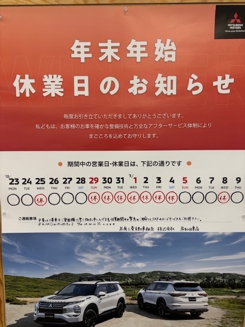 Staff Blog スタッフブログ 202412/26 ★年末年始休業のお知らせ★ こんにちは! 岸和田東店 西野です! 今年も残すところ1週間切りました。。 2024年も長いようで短… 202412/23 展示車入れ替えました! おはようございます! 岸和田東店西野です! 展示車入れ替えしました! 今回は、デリカミニ Gプレミア… 202412/20 ご当地デリ丸登場しました! こんにちは! 岸和田東店西野です! 只今、当店でご当地デリ丸販売中です! 第一弾は「北海道・関東東北… 202412/08 トライトン「デザイン・カー・オブ・ザ・イヤー」受賞しました!! こんにちは! 岸和田東店 西野です! 今回は、デリカミニに続いてトライトンも 「デザイン・カー・オブ… 202412/07 アウトランダーPHEVの外装品の取付をしました! こんにちは! 岸和田東店 西野です! 試乗車のアウトランダーPHEVの外装品の取付をしました! 見た… 202411/30 ★白デリ丸&黒デリ丸登場★ こんにちは! 岸和田東店西野です! 3月31日までにデリカミニ(全グレード全色対象)を指定のディーラ… 202411/26 新型アウトランダーPHEV今がお得です! こんにちは! 岸和田東店西野です! 早速ですが、新型アウトランダーPHEVに限り残価設定型のマイカー… 202411/16 ★新型アウトランダーPHEVをご紹介★ こんにちは! 岸和田東店 西野です! 早速ですが、今回は新型アウトランダーPHEVの便利な機能をちょ… 202411/09 展示車入ってきました! こんにちは! 岸和田東店 西野です! 早速ですが、デリカD:5ブラックエディションと新型アウトランダ… 202411/07 外壁塗装工事完了致しました! こんにちは!岸和田東店 西野です! 今日は朝からずっと肌寒い1日でしたね。。 これから年末年始これよ… 202411/05 デリカミニ&新型アウトランダーPHEV人気ランキング! こんにちは! 岸和田東店 西野です! 最近は朝晩の冷え込みが厳しくなってきて、急に冬がやってきた感じ… 202411/01 アウトランダーPHEV好評です! こんにちは! 岸和田東店 西野です! 只今、新型アウトランダーPHEVを残価設定のクレジットでご契約… 202410/28 新型アウトランダーPHEV入庫しました!! こんにちは! 岸和田東店 西野です! 新型アウトランダーPHEVが遂に当店にきました! ボディ色は、… 202410/22 外壁塗装工事中です💦 こんにちは! 岸和田東店 西野です! 只今、当店では外壁塗装工事中となっております 明日は定休日の為… 202410/19 ★カスタムコンプリートカー襲来!!!★ 皆さんこんにちは! 泉南三菱 営業の柴田です! 泉南三菱では本日、カスタム相談会を開催しております… 202410/17 ★白デリ丸・黒デリ丸プレゼント★ こんにちは! 岸和田東店 西野です! 只今、キャンペーンでデリカミニご成約して頂いた方で エンブレム… 202410/14 エクリプスクロスPHEVラリーアート仕様にしました! おはようございます! 岸和田東店 西野です! 今回は、試乗車のエクリプスクロスPHEVをラリーアート… 202410/12 中古車が入庫しました!!!! こんにちは! 岸和田東店 西野です! 今回新しく5台の中古車が入庫しました(*'▽') ご成約特典で… Show More